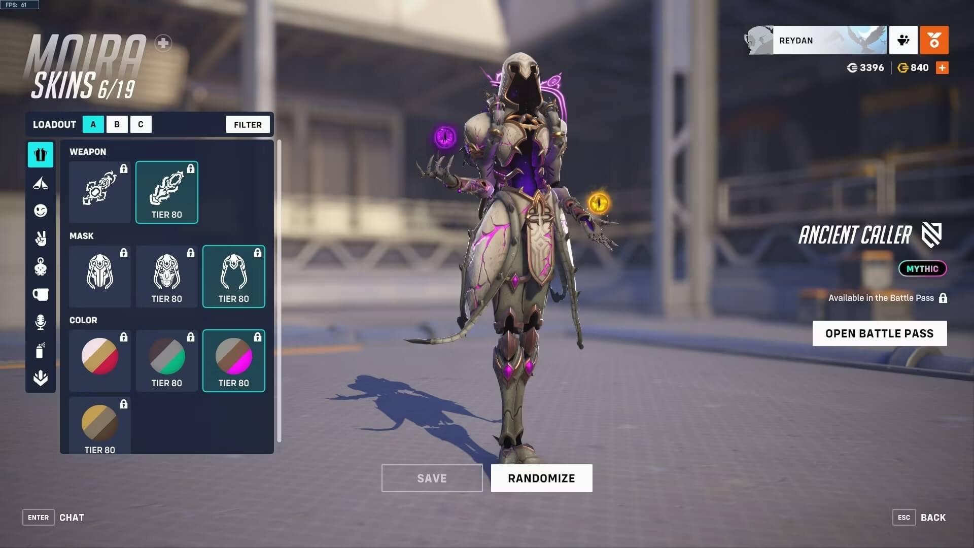 Ancient Caller Moira thể hiện chủ đề kinh dị ma quái của Battle Pass mới với 9 tùy chọn tùy chỉnh trải dài trên 3 danh mục: Vũ khí, Mặt nạ và Màu sắc. Mặc dù không hoàn toàn khớp với 11 tùy chọn của Cyber Demon Genji, Amaterasu Kirko hoặc Galactic Emperor Sigma, nó vẫn xếp hạng trong nhóm hàng đầu cùng với Zeus Junker Queen và Adventurer Tracer.