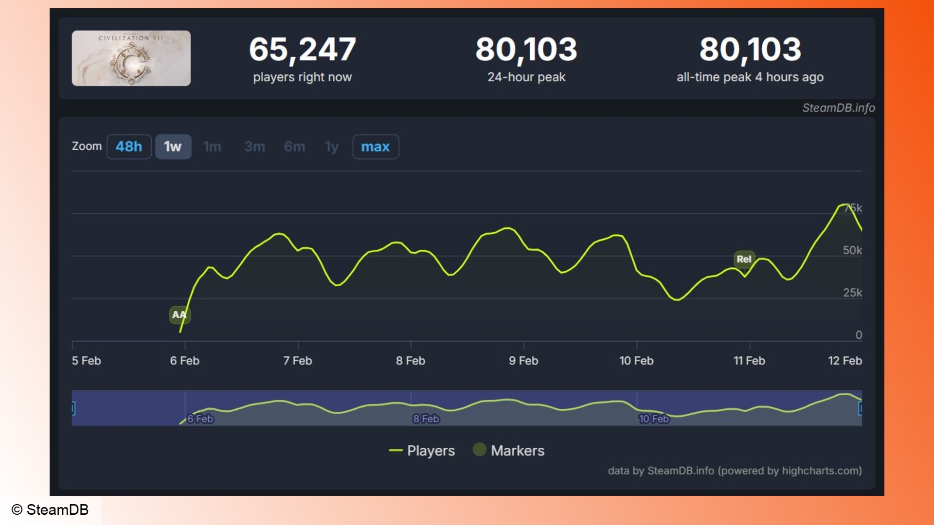 Trong giai đoạn early access, lượng người chơi đồng thời cao nhất mà Civilization 7 đạt được là khoảng 66.000. Vào ngày phát hành chính thức hôm nay, ngày 11 tháng 2, con số này đã vượt mốc 80.000 người chơi – một sự tăng trưởng khiêm tốn nhưng đáng hoan nghênh.