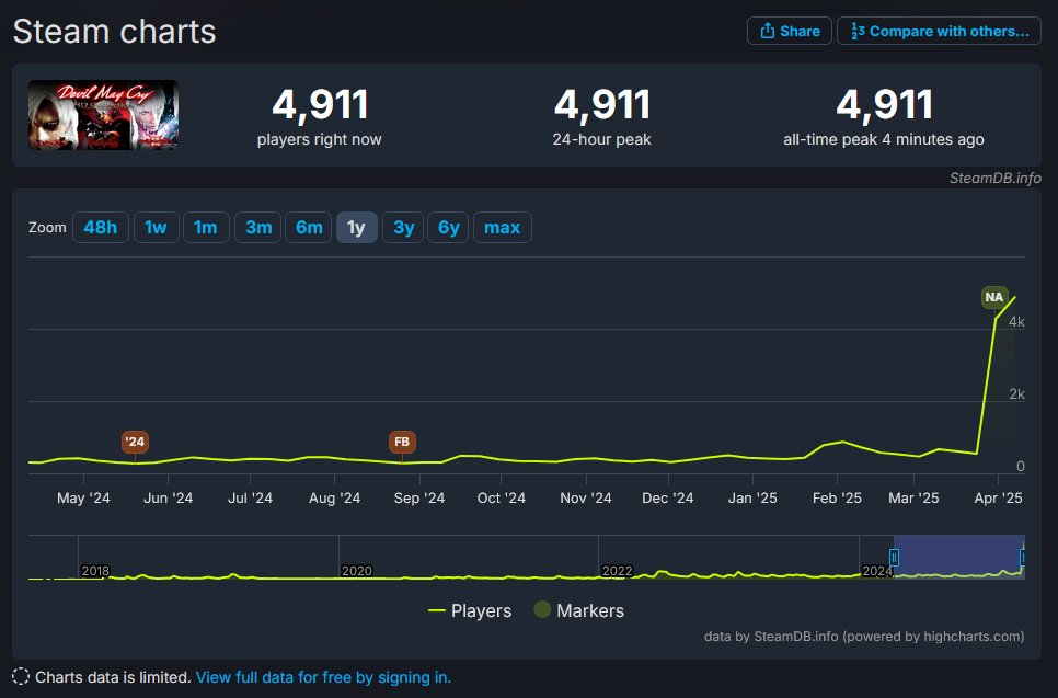 Theo dữ liệu từ Steam database, số lượng người chơi của tất cả các tựa game Devil May Cry trên Steam đã tăng đáng kể kể từ ngày 3 tháng 4, với phiên bản mới nhất đạt mức tăng cao nhất.
