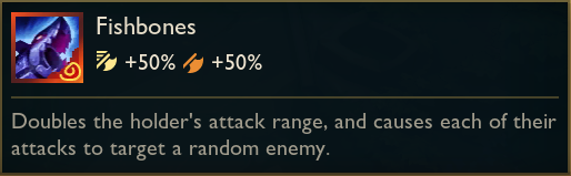 Tăng gấp đôi tầm đánh của người sở hữu, đồng thời khiến mỗi đòn tấn công của họ nhắm vào một kẻ địch ngẫu nhiên. |