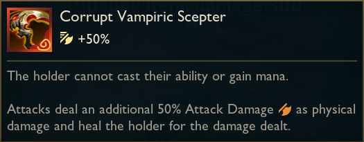 Người sở hữu không thể sử dụng kỹ năng hoặc nhận năng lượng. Đòn tấn công gây thêm 50% sát thương vật lý và hồi phục cho người sở hữu lượng máu tương ứng với sát thương gây ra. |