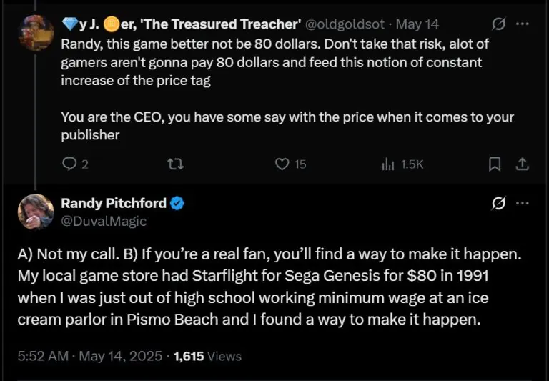 “Nếu bạn là một fan chân chính, bạn sẽ tìm cách để điều đó xảy ra,” ông nói về mức giá 80 USD. “Cửa hàng game gần nhà tôi từng bán Starflight cho Sega Genesis với giá 80 USD vào năm 1991, khi tôi vừa tốt nghiệp trung học và làm việc với mức lương tối thiểu tại một tiệm kem ở Pismo Beach, và tôi đã tìm cách để mua nó.”