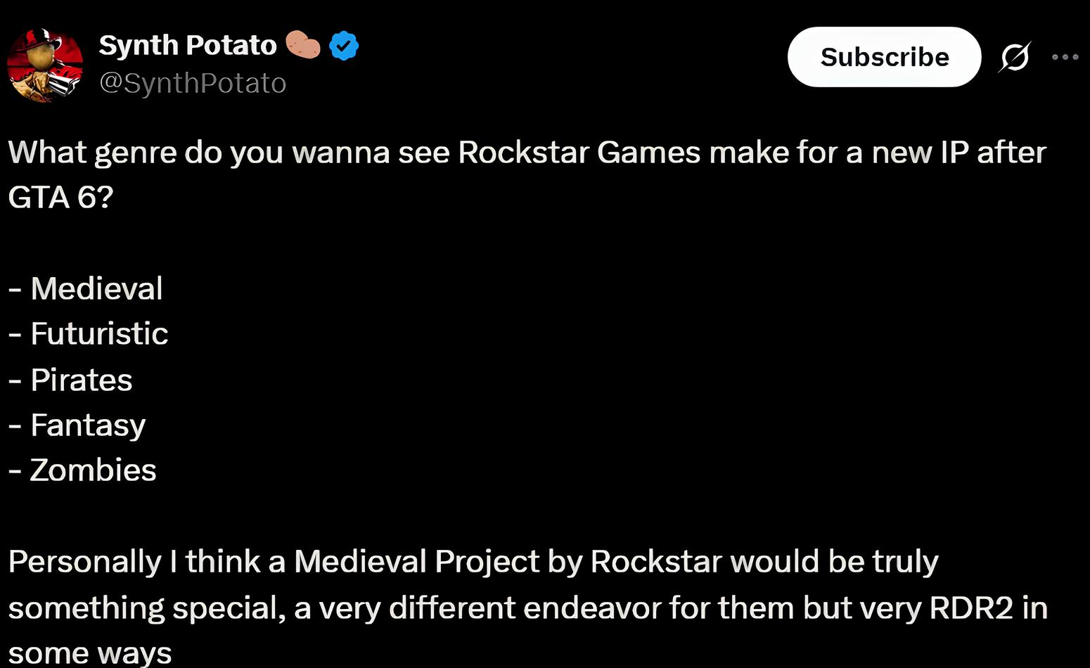 Gần đây, tài khoản Synth Potato trên X (trước đây là Twitter) đã đặt câu hỏi cho người hâm mộ về thể loại mà họ muốn Rockstar phát triển cho một IP mới sau GTA 6. Trong khi nhiều người mong muốn Rockstar làm Bully 2 hoặc RDR3, một số khác lại muốn nhà phát triển này tạo ra một IP hoàn toàn mới dựa trên bối cảnh Trung Cổ.