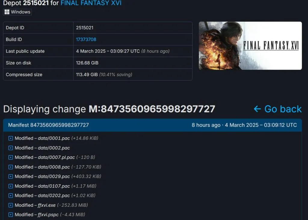 Dữ liệu từ SteamDB cho thấy bản cập nhật mới nhất đã mang đến nhiều thay đổi đáng kể cho Final Fantasy 16. Thay đổi đáng chú ý nhất là ở tệp exe, dấu hiệu rõ ràng cho thấy Denuvo đã bị loại bỏ. Những thay đổi tương tự cũng được ghi nhận khi Denuvo bị gỡ bỏ khỏi Suicide Squad. Tương tự như “Suicide Squad”, “Final Fantasy 16” cũng đã bị “crack” sau khi Denuvo bị gỡ bỏ, xác nhận rằng tựa game không còn được bảo vệ bởi hệ thống này.
