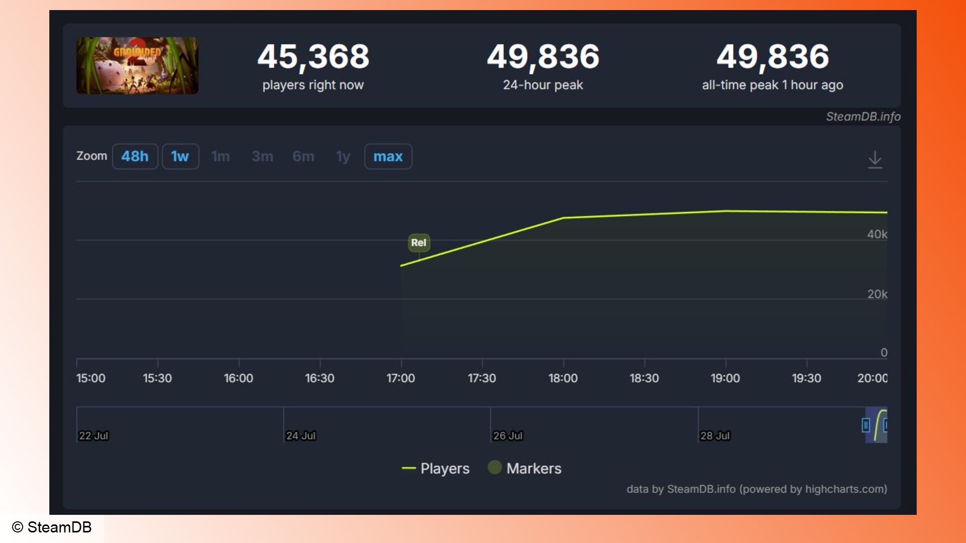 Trên Steam, màn ra mắt của Grounded 2 đã đạt đỉnh gần 50.000 người chơi cùng lúc. Đây là một con số rất ấn tượng, đặc biệt khi hàng triệu người đăng ký Game Pass có thể chơi game ngay lập tức mà không tốn thêm chi phí. Con số này cũng vượt xa kỷ lục mọi thời đại của phần game Grounded gốc, vốn chỉ ở mức khoảng 32.000 người.