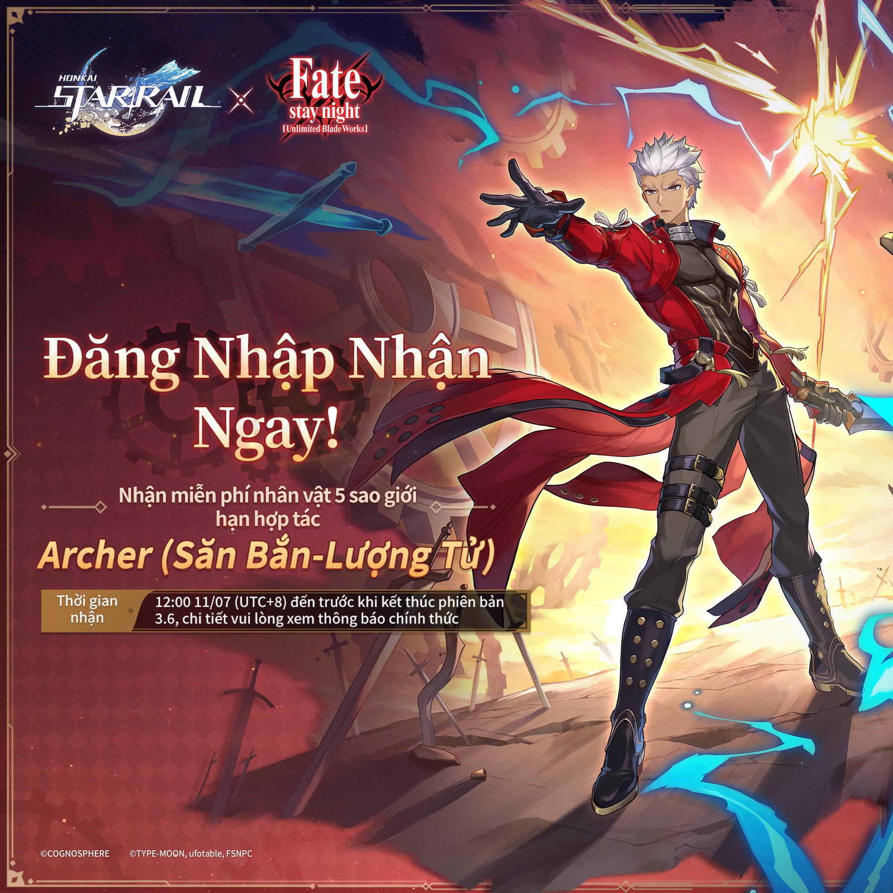 Một tin vui đặc biệt dành cho người chơi, nhân vật Archer 5 sao sẽ được tặng hoàn toàn miễn phí cho tất cả Nhà Khai Phá khi đăng nhập vào game trong khoảng thời gian từ ngày 11 tháng 7 cho đến khi kết thúc phiên bản 3.6 của trò chơi. Saber sẽ có mặt trong một banner sự kiện hợp tác đặc biệt sắp tới đây. Honkai: Star Rail là tựa game nhập vai phiêu lưu không gian miễn phí được phát hành lần đầu vào tháng 4 năm 2023. Hiện tại, trò chơi có sẵn trên PC , iOS , Android và PlayStation 5.