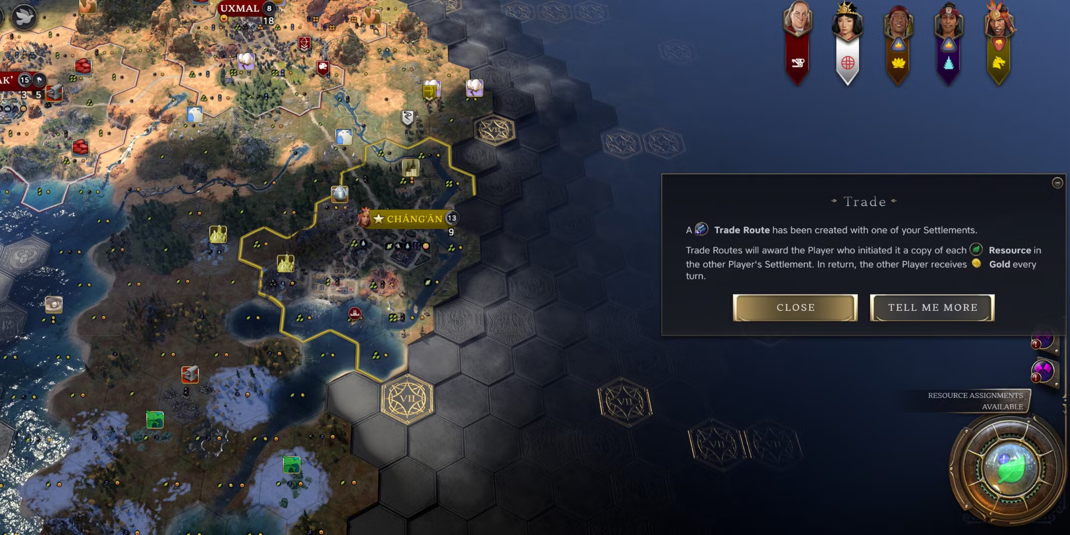 Nếu bạn gửi Thương nhân của mình đến những khu vực này và thiết lập Tuyến đường thương mại, bạn sẽ nhận được một bản sao của những tài nguyên này. Để thực hiện giao dịch, bạn phải di chuyển đơn vị Thương nhân của mình vào lãnh thổ của khu định cư đích. Bạn không thể nhấp vào khu định cư trong danh sách các vị trí có thể giao dịch, bạn phải tự di chuyển Thương nhân đến đó trong vài lượt.