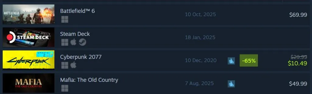 Cyberpunk 2077 đang ở vị trí thứ hai, chủ yếu nhờ vào đợt giảm giá sâu 65% và thực tế rằng đây là một trong những tựa game xuất sắc nhất từng được tạo ra. Ngay bên dưới là Mafia: The Old Country.
