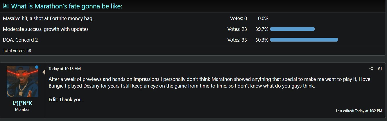 Một cuộc khảo sát mới trên mạng xã hội cho thấy phần lớn người chơi tin rằng Marathon sẽ thất bại giống như Concord, thay vì đạt được thành công vừa phải. Chỉ một số ít người trong cộng đồng lên tiếng bảo vệ trò chơi và cho rằng nó có thể trở thành một hit trong dòng game live-service.