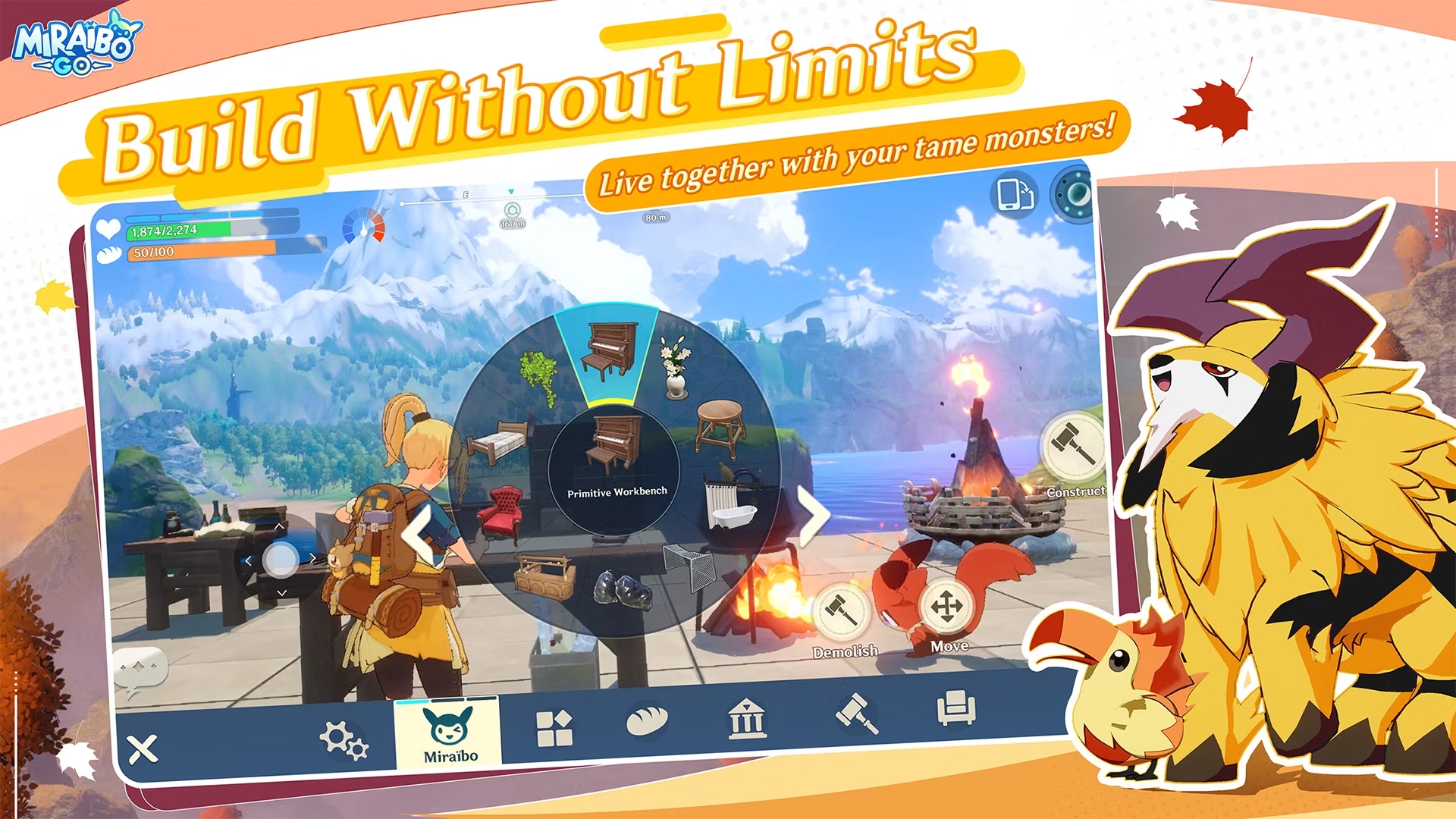 Hệ thống nuôi dưỡng quái vật này sẽ được kết hợp với cơ chế xây dựng cơ sở phức tạp và một thế giới mở rộng lớn, đây là sự kết hợp khiến Miraibo GO trông giống với Palworld. Giống như trò chơi hit của Pocketpair, Miraibo GO cũng sẽ có chế độ chơi co-op nhiều người. Để đạt được điều này, nó sẽ cung cấp các trường hợp được gọi là Guild Worlds, được thiết kế đặc biệt cho trải nghiệm nhóm và sẽ hỗ trợ tối đa 24 người chơi khi ra mắt. Ngoài việc xây dựng cơ sở, huấn luyện Miras và sinh tồn trong hoang dã, người chơi cũng sẽ có cơ hội đối đầu với nhiều loại boss, cùng với các hoạt động khác.