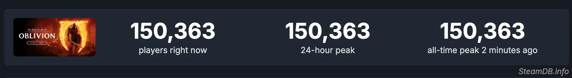 Thành công ban đầu này đã giúp Oblivion Remastered nhanh chóng vượt mặt nhiều tựa game đình đám khác như Baldur’s Gate 3 và Path of Exile 2 về lượng người chơi đồng thời trên Steam, đồng thời đang bám đuổi sát sao các trò chơi có lượng người chơi lớn khác như Marvel Rivals.