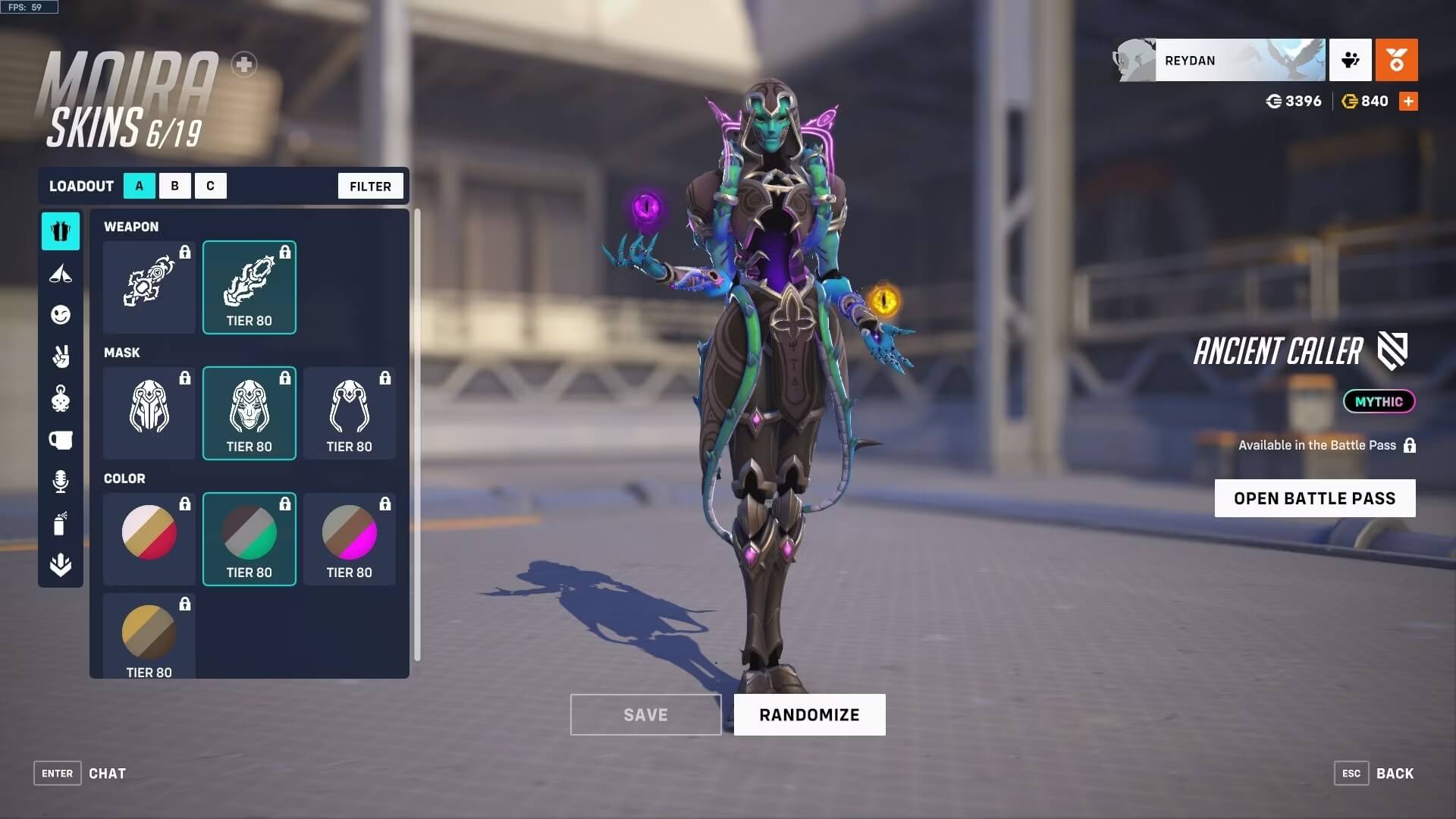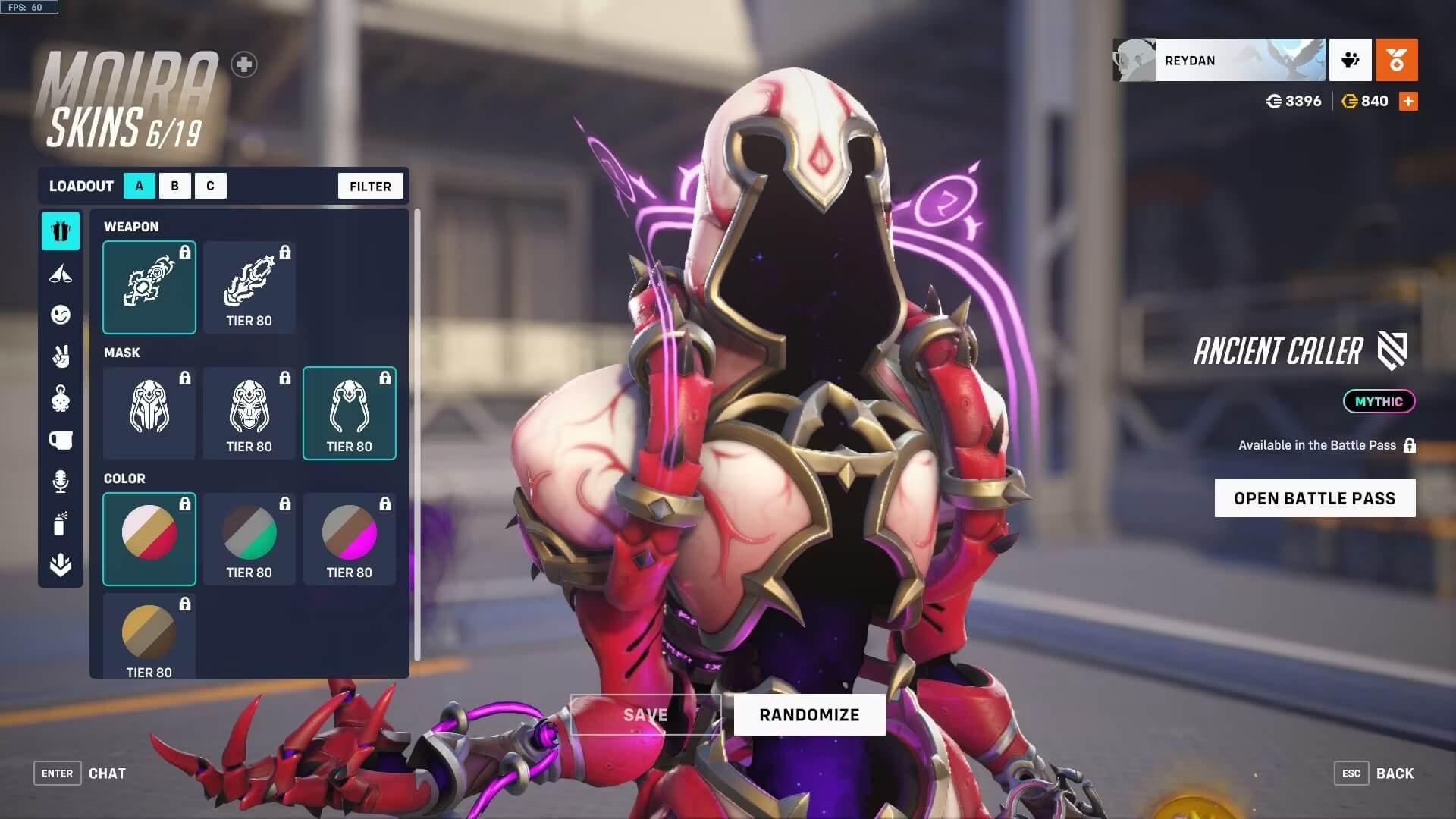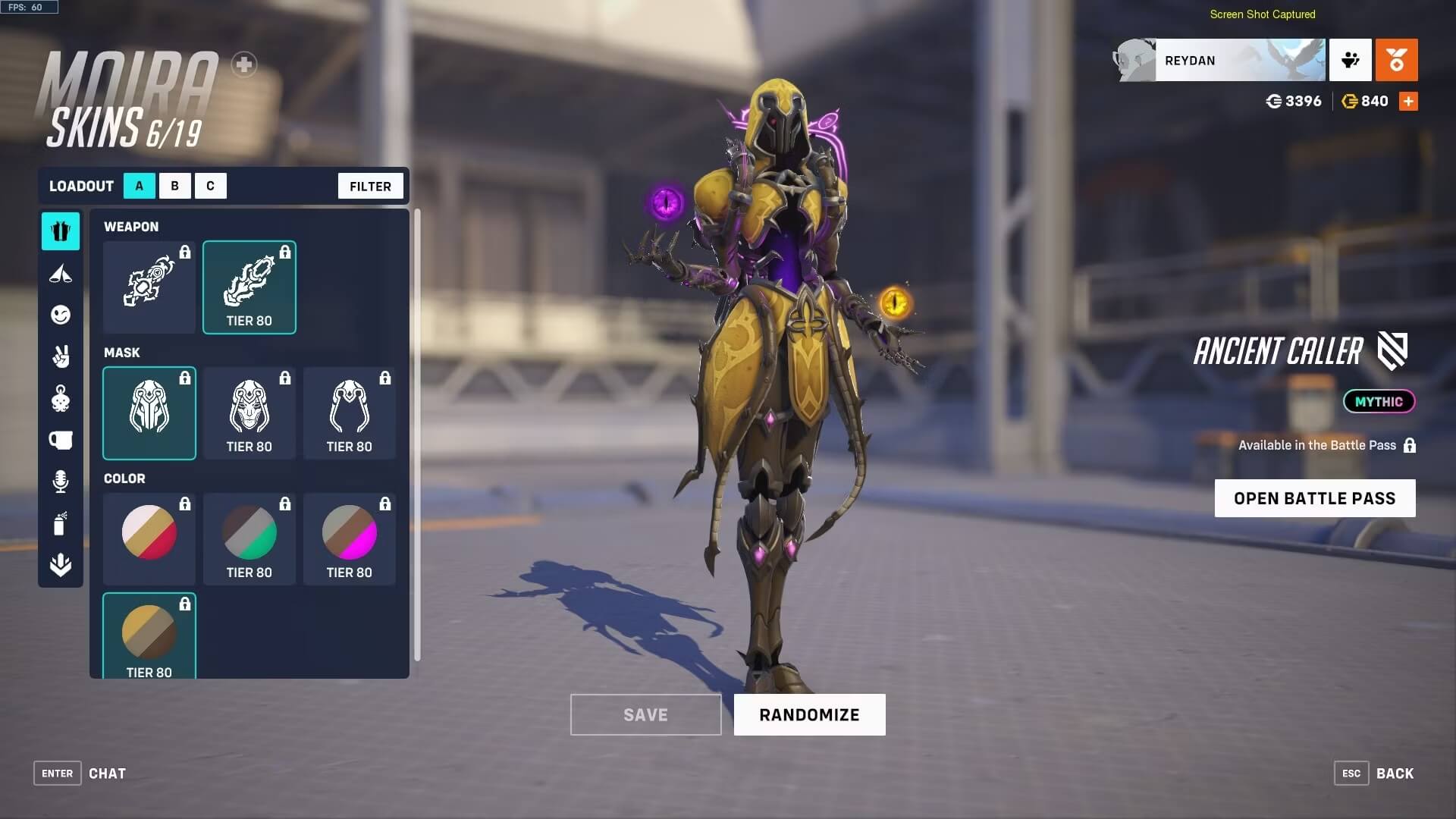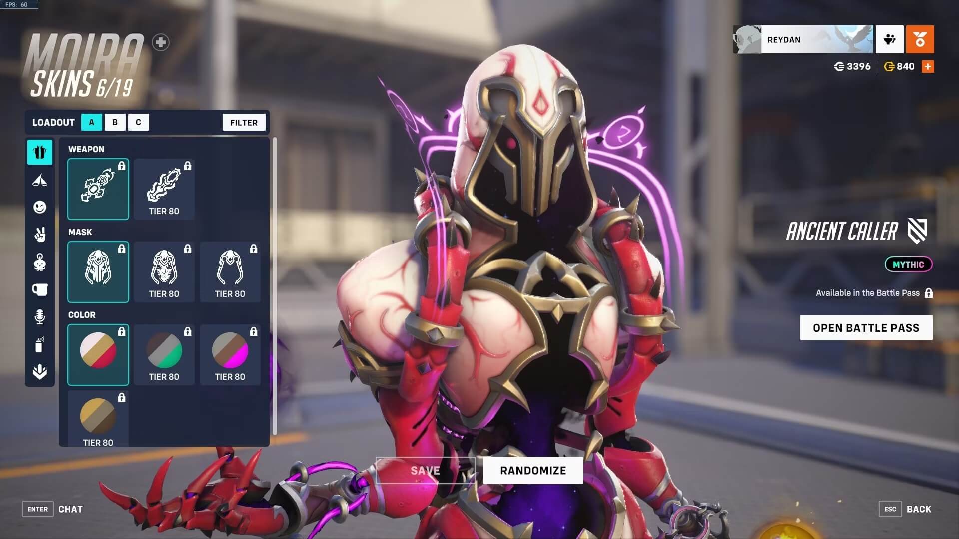 Ancient Caller Moira thể hiện chủ đề kinh dị ma quái của Battle Pass mới với 9 tùy chọn tùy chỉnh trải dài trên 3 danh mục: Vũ khí, Mặt nạ và Màu sắc. Mặc dù không hoàn toàn khớp với 11 tùy chọn của Cyber Demon Genji, Amaterasu Kirko hoặc Galactic Emperor Sigma, nó vẫn xếp hạng trong nhóm hàng đầu cùng với Zeus Junker Queen và Adventurer Tracer.