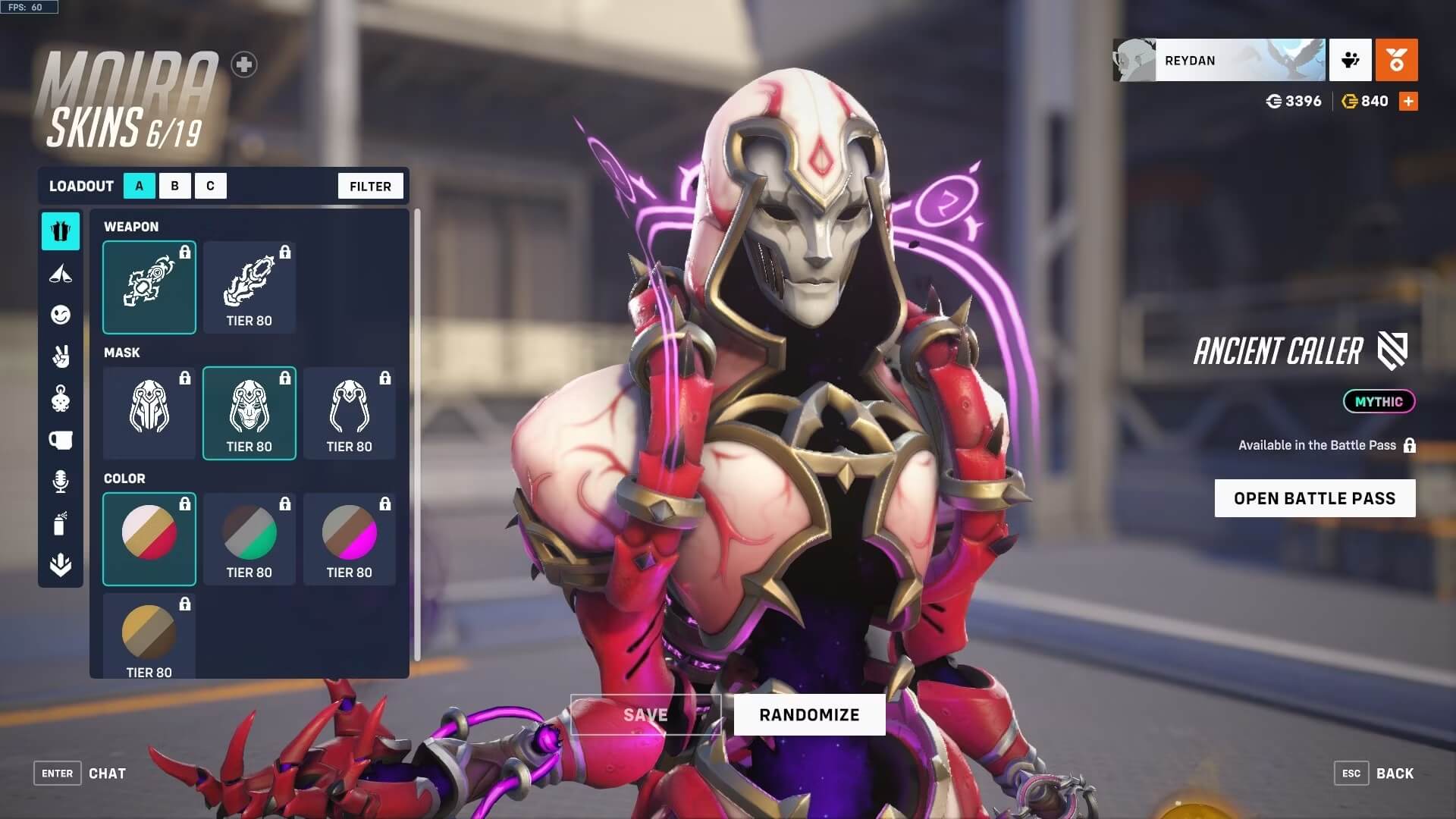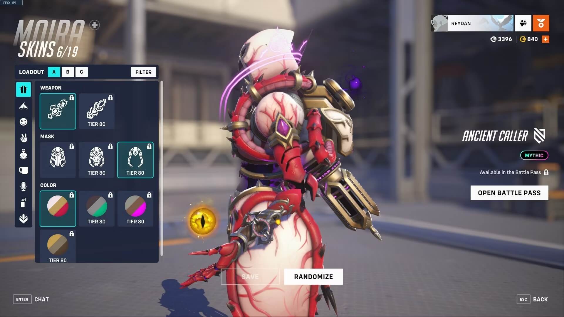 Ancient Caller Moira thể hiện chủ đề kinh dị ma quái của Battle Pass mới với 9 tùy chọn tùy chỉnh trải dài trên 3 danh mục: Vũ khí, Mặt nạ và Màu sắc. Mặc dù không hoàn toàn khớp với 11 tùy chọn của Cyber Demon Genji, Amaterasu Kirko hoặc Galactic Emperor Sigma, nó vẫn xếp hạng trong nhóm hàng đầu cùng với Zeus Junker QueenAdventurer Tracer.