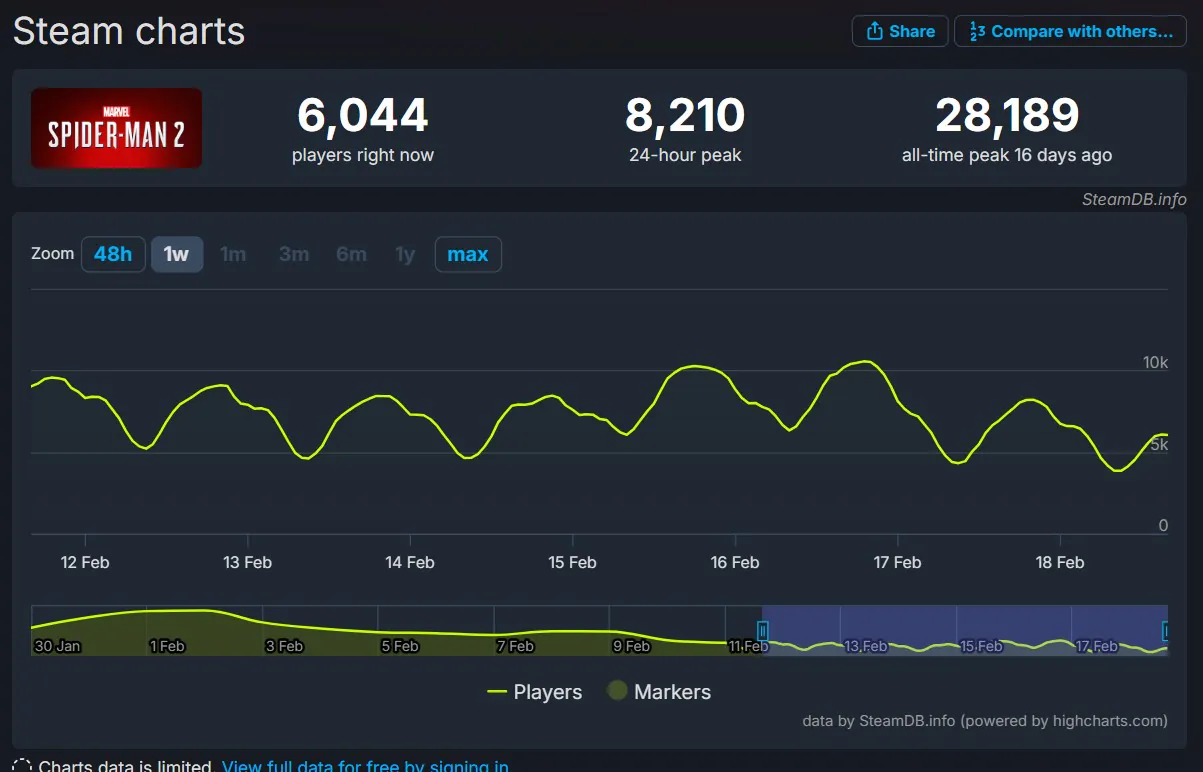 Spider-Man 2 chỉ đạt trung bình khoảng 8.000 người chơi đồng thời. Nhìn vào số lượng người chơi cao nhất, trò chơi chỉ đạt hơn 28.000 người chơi. Điều này khiến tựa game trở thành một trong những lần ra mắt PC tệ nhất từ PlayStation, vì các trò chơi khác như Ghost of Tsushima Director’s Cut, The Last of Us Part 1 và thậm chí cả Marvel’s Spider-Man Remastered đều có lượng người chơi cao hơn nhiều.