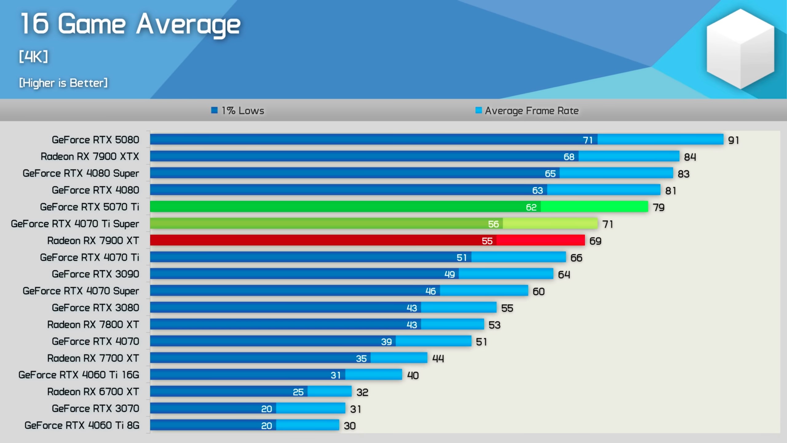 Kết quả thử nghiệm từ Hardware Unboxed cho thấy RTX 5070 Ti đạt trung bình 79 FPS ở độ phân giải 4K. Điều này chỉ nhỉnh hơn RTX 4070 Ti Super khoảng 11% khi chơi các tựa game như The Last of Us Part 1, Dragon Age: The Veilguard và nhiều game khác.