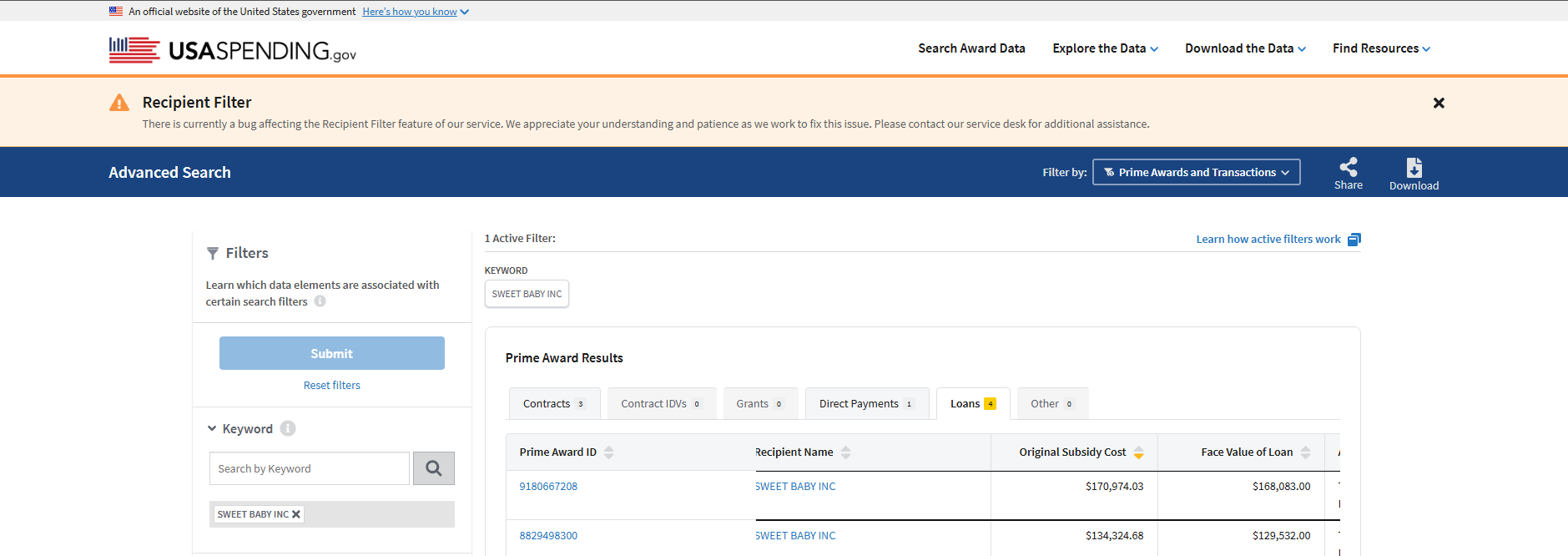 Theo USAspending, trang web chính thức của Mỹ theo dõi chi tiêu của chính phủ, Sweet Baby đã nhận được hơn 300.000 USD (khoảng 7 tỷ VNĐ). Số tiền này được phân bổ để duy trì lực lượng lao động của công ty trong thời kỳ đại dịch.